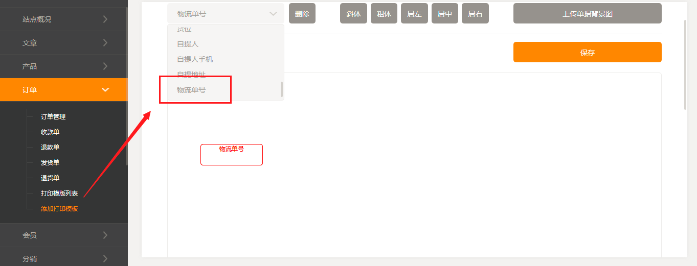1. 在建站后台,“订单”-“添加打印模板”中,新增了物流单号字段,如图所示: