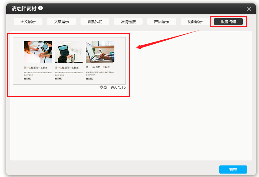 1. 在pc版建站,素材模块中新增了一个分类“服务咨询”,并新增了一个样式,如图所示: