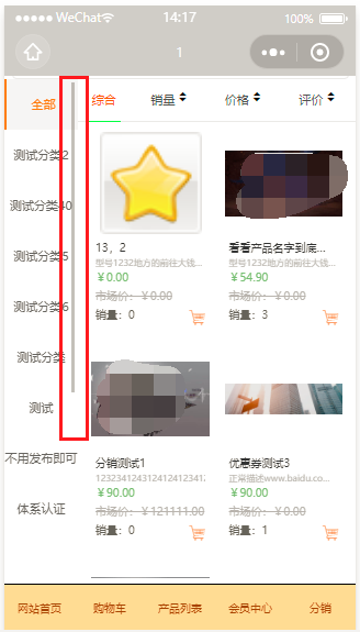 1. 在小程序中,拖出“产品列表”插件,选择样式1,修复了左侧分类的滚动条,如图所示: