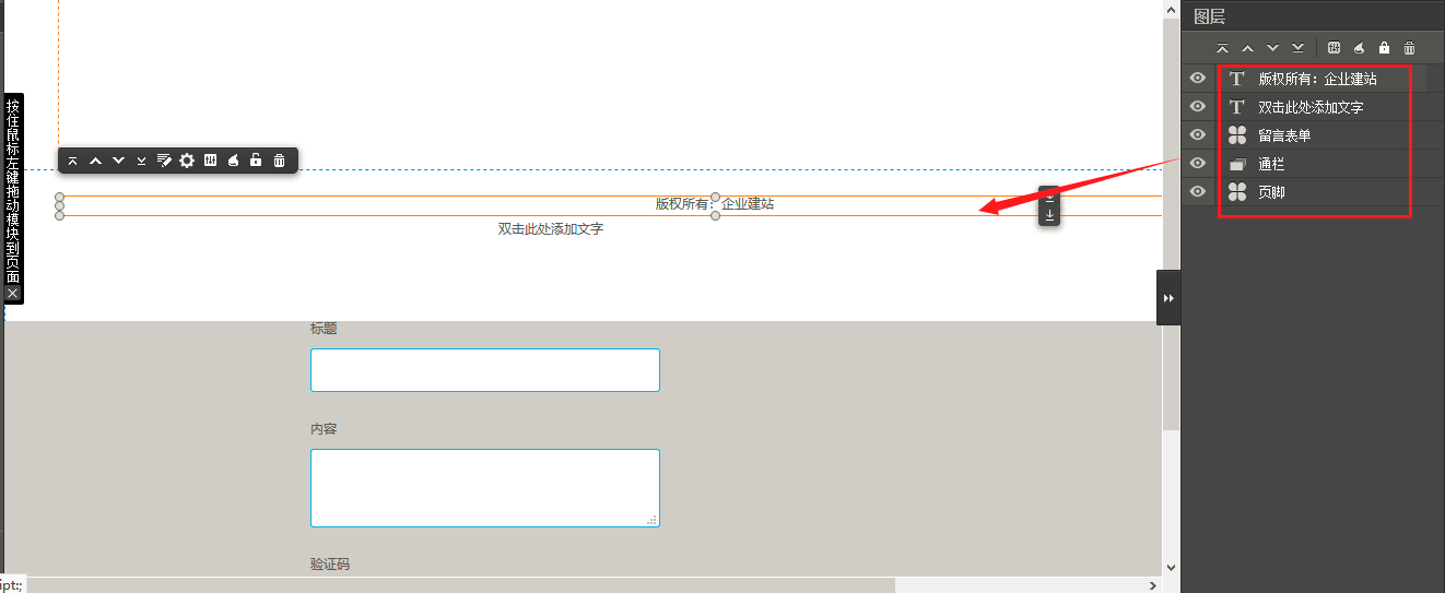 1. 在建站设计师模式,页脚模块中的元素也会正确的在图层中显示了,如图所示:
