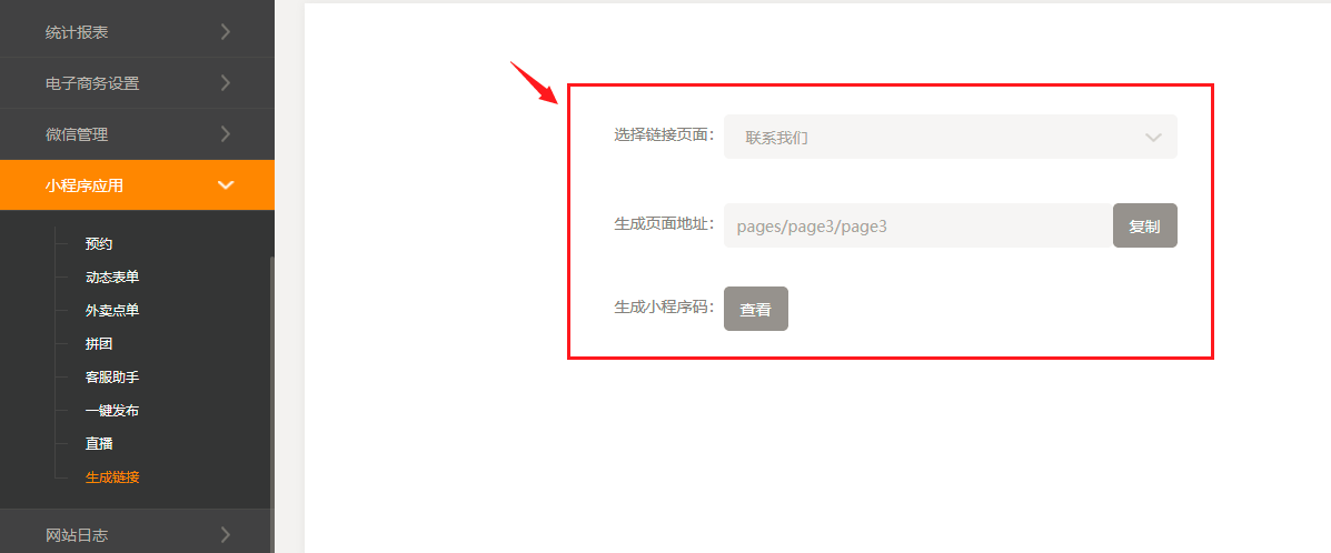 1. 在建站后台,“小程序应用”中,新增了“生成链接”功能,选择页面后,生成页面地址一栏即自动显示出地址,小程序码也会自动生成。