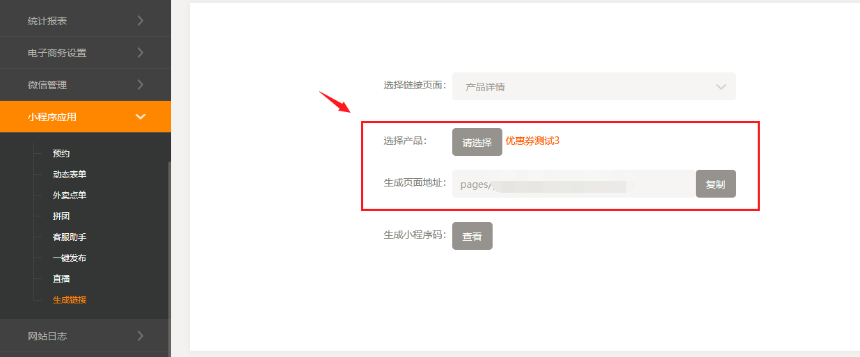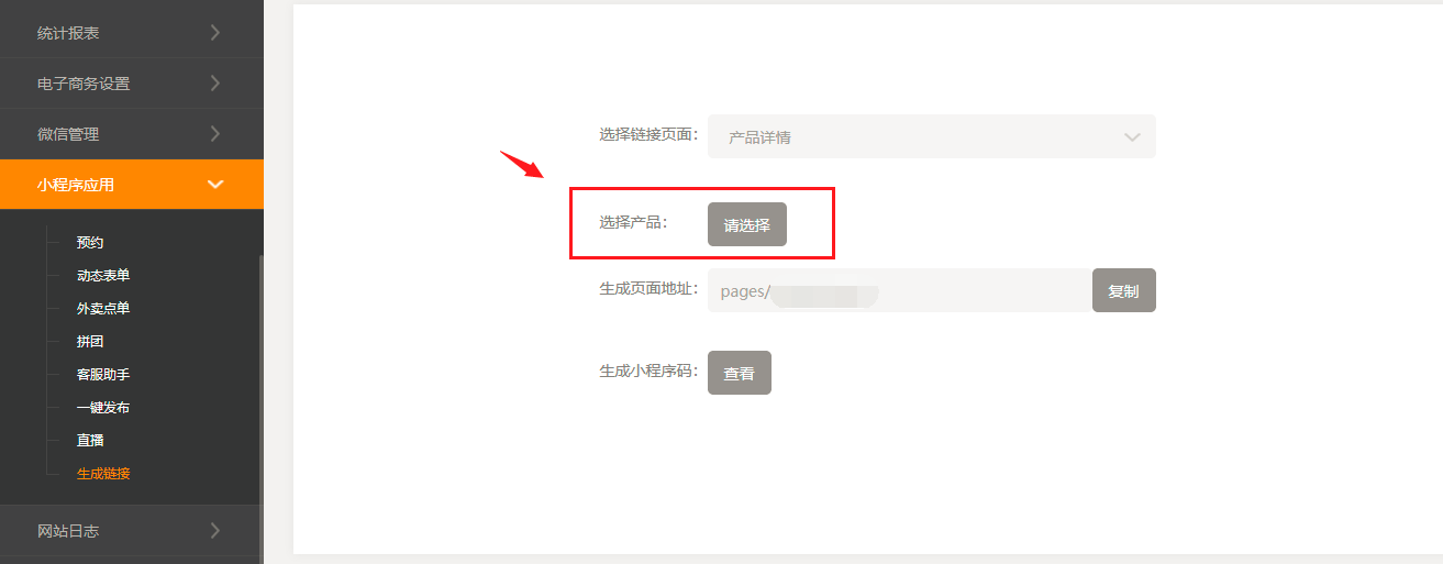 2. 当选择的页面中有产品详情插件时,可以选择具体的产品来生成地址,如图所示: