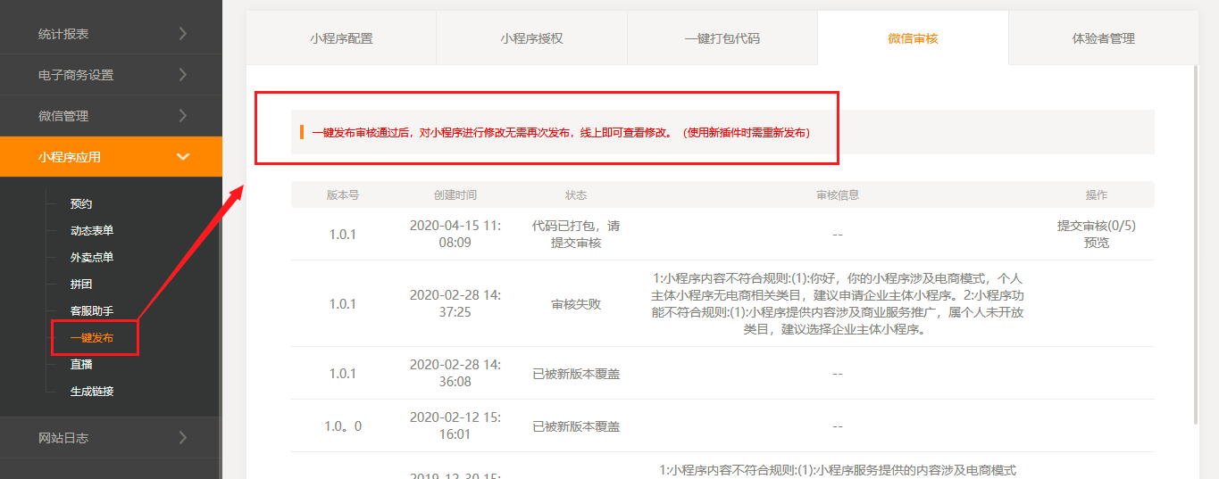 3. 在建站后台,“小程序应用”-“一键发布”-“微信审核”中,添加了提示“一键发布审核通过后,对小程序进行修改无需再次发布,线上即可查看修改。(使用新插件时需重新发布)”。