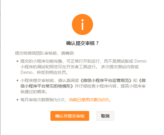 4. 一键发布现在每个月发布次数上限为5次。点击“提交审核”会提出弹窗,提示小程序规范、常规被拒情形和发布次数。