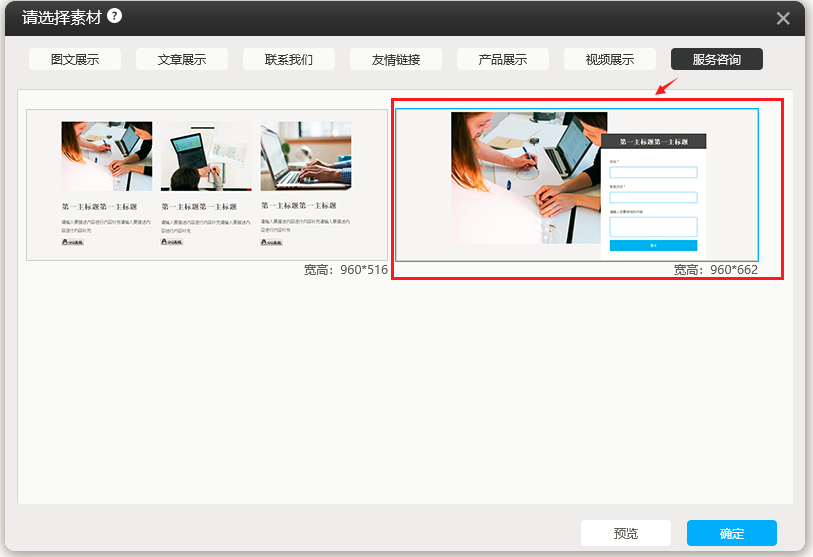 1. 在pc版建站,素材模块“服务咨询”中新增了一个样式,如图所示: