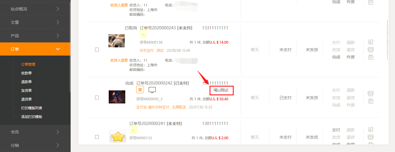 1. 在建站后台,“订单”-“订单管理”中,在如图位置增加了下单会员的姓名,如图所示: