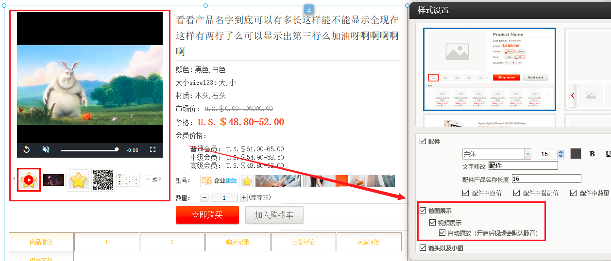 2. 在建站pc版中,拖出“产品详情”插件,在样式设置中可以对首图展示、视频展示、自动播放进行设置。