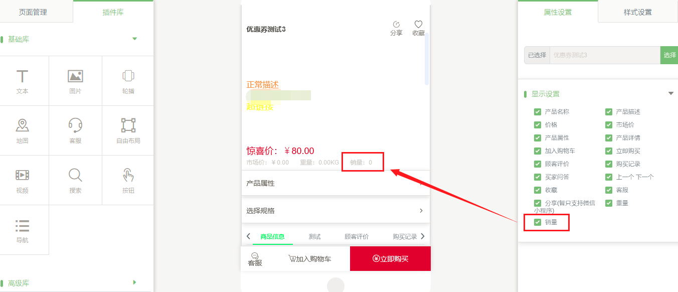1. 在小程序编辑器中,拖出“产品详情”插件,在显示设置中新增了销量的设置项,如图所示:
