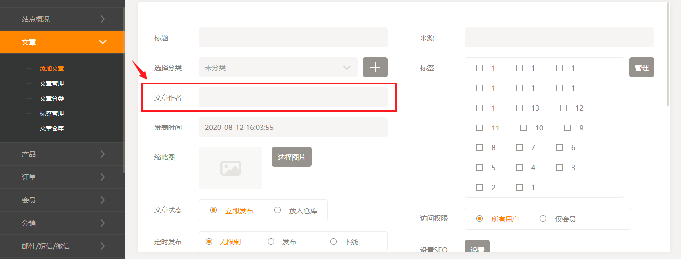 1. 在建站后台,“文章”-“添加文章”时,现在不会再自动填写文章作者了,如图所示: