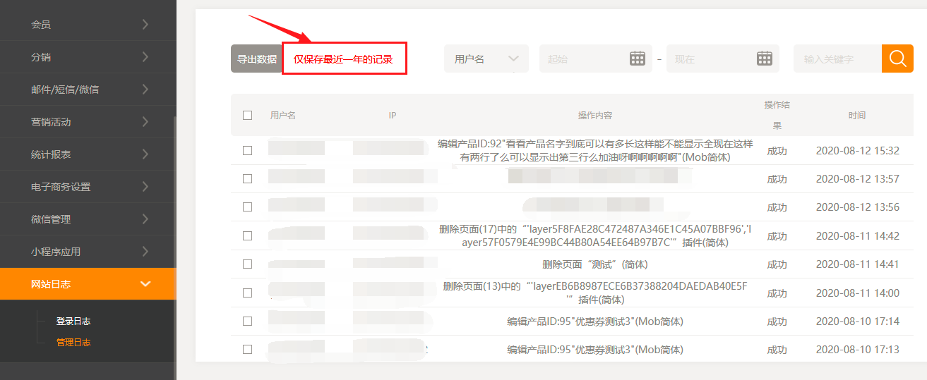 1. 在建站后台,“网站日志”-“管理日志”中,新增了关于保存时间的提示,如图所示: