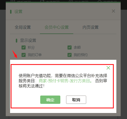 1. 在小程序编辑器,“设置”-“会员中心设置”中,勾选“账户充值”时,会给出弹窗提示,如图所示: