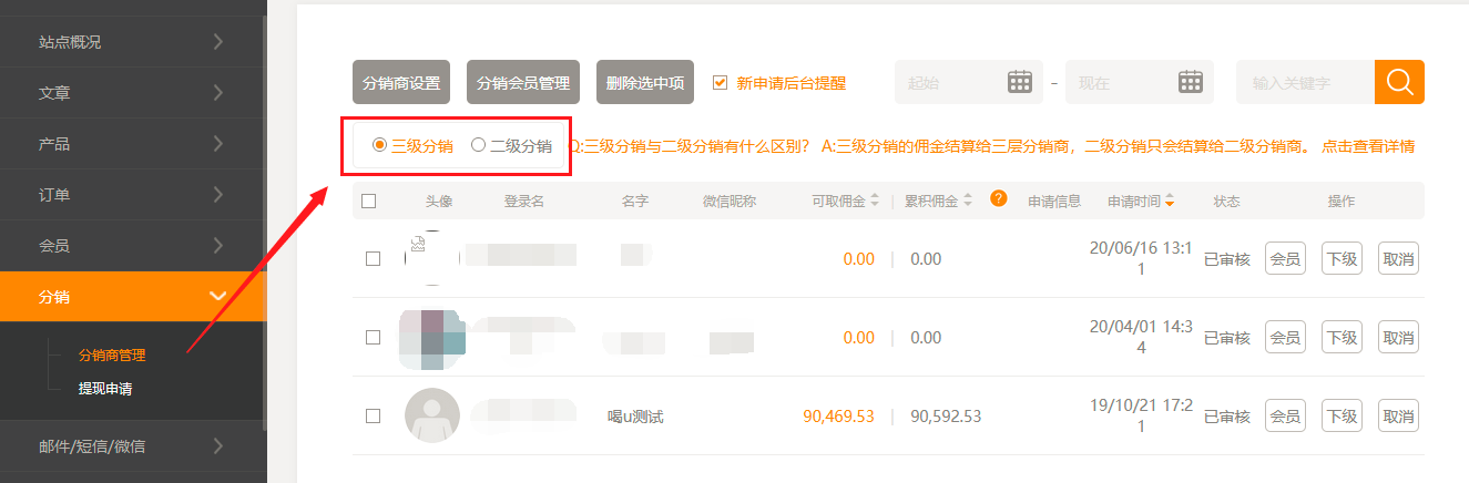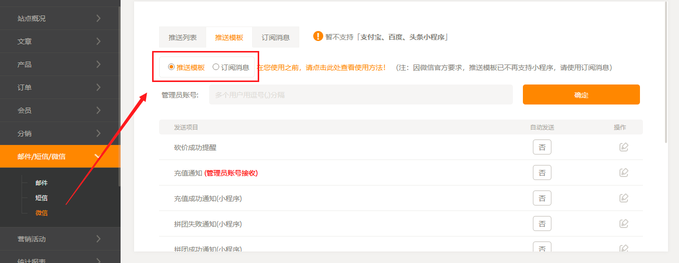 1. 在建站后台,“分销”-“分销商管理”和“邮件/短信/微信”-“微信”页面中,原先的切换开关改为了单选框样式,更一目了然了,如图所示: