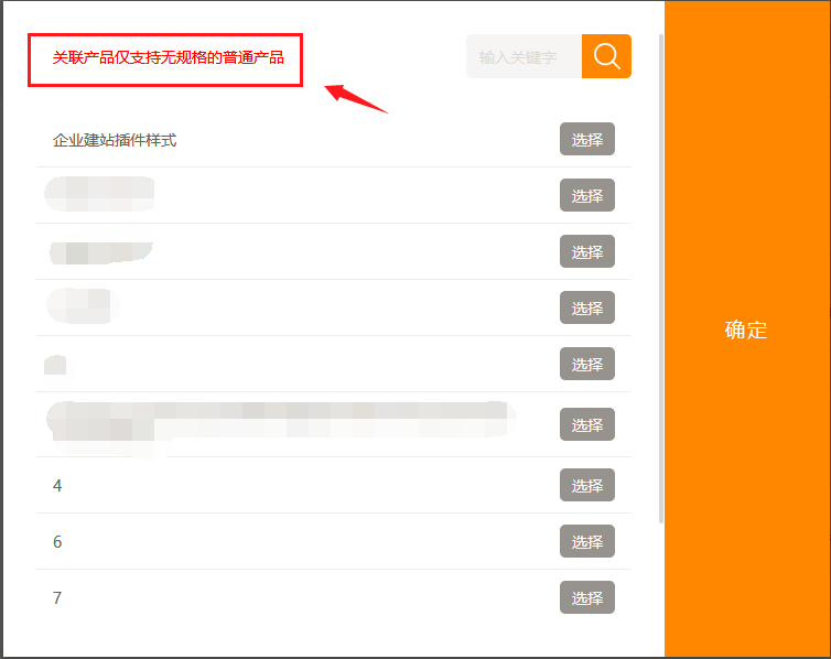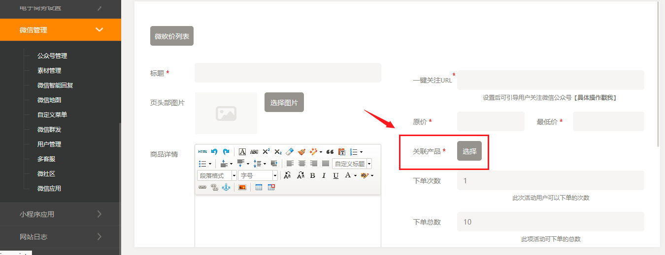 1. 在建站后台,“微信管理”-“微信应用”-“微砍价”中,添加/编辑微砍价时,选择关联产品的弹窗里增加了提示“关联产品仅支持无规格的普通产品”,如图所示: