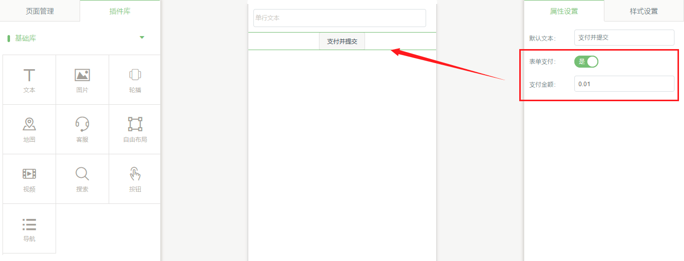 1. 在小程序编辑器中,拖出“表单”插件,新增“提交按钮”,在属性设置中新增了表单支付的开关,打开后可以设置金额,用户点击这个按钮后就会唤醒微信支付,如图所示: