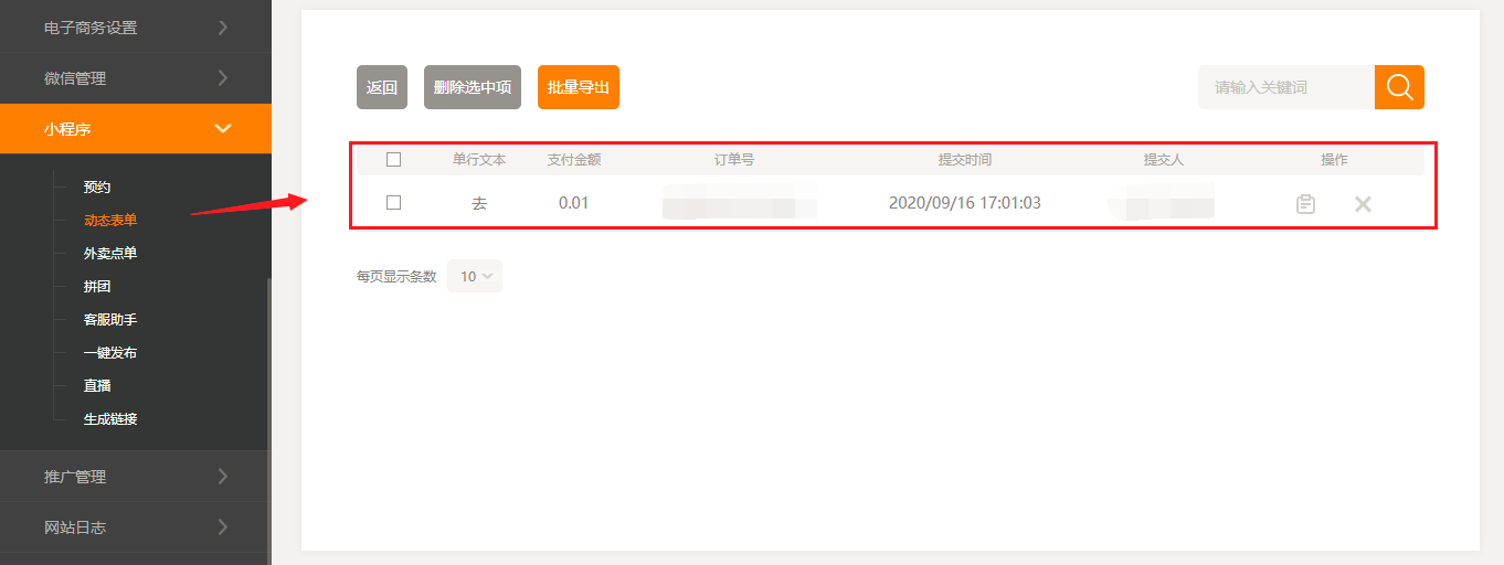 2. 在建站后台,“小程序”-“动态表单”,查看表单数据,可以看到支付相关的信息,如图所示: