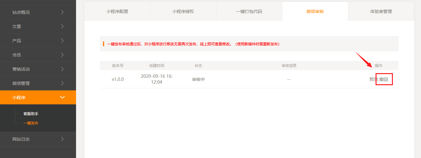 1. 在建站后台,“一键发布”-“微信审核”中,现在提交审核后,可以自己撤回了,如图所示: