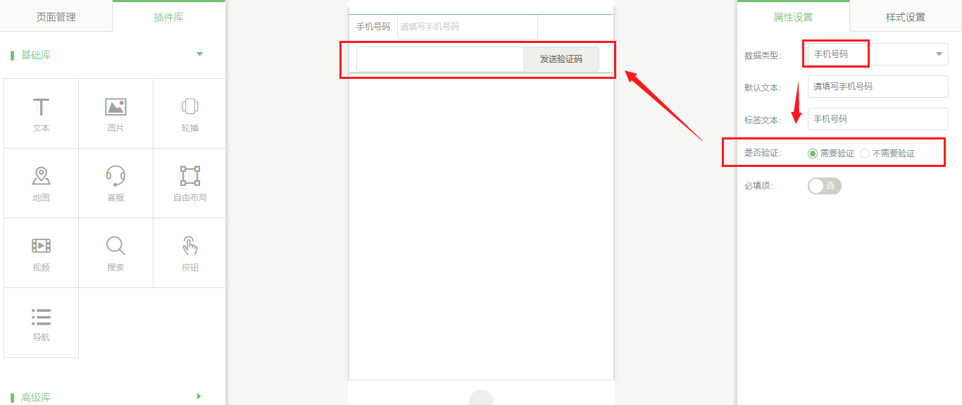 1. 在小程序编辑器中,拖出“表单”插件,新增“单行文本”,当数据类型为手机号码时,可以设置是否验证手机号,如图所示:
