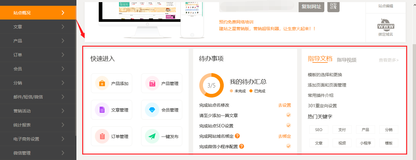 1. 在建站后台,站点概况页面新增了“快速进入”、“待办事项”、指导区域。其中,“快速进入”区域是一些常用功能;“待办事项”是一些基础的建站设置,帮助用户更快上手;指导区域里包含了文章帮助和视频帮助,方便用户查看,如图所示: