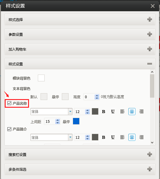1. 在pc版建站,拖出“产品列表”插件,样式设置中的设置项字体现在修复成统一的了,单选框也和设置项保持一个高度了,如图所示: