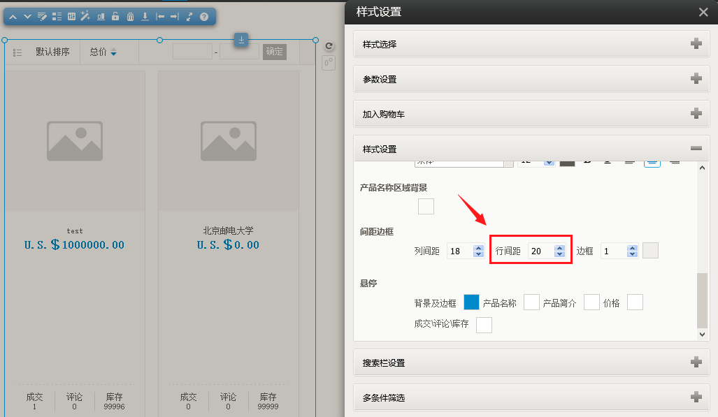 1. 在pc版建站,拖出“产品列表”插件,在第三个样式中新增行间距的设置项,如图所示: