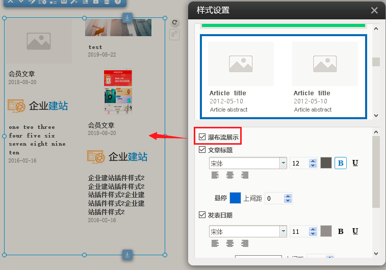 1. 在pc版建站,拖出“文章列表”插件,在设置里将图片格式设置为按比例显示,再选择样式6开始瀑布流,现在不会再出现大片的空白了,如图所示: