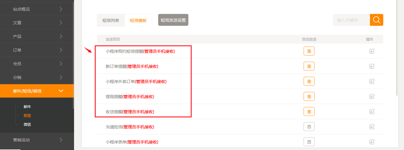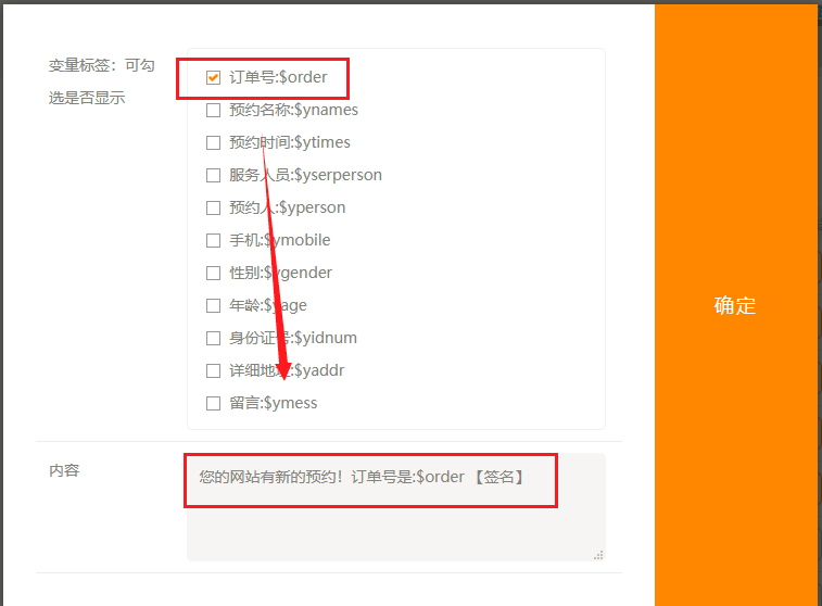 1. 在建站后台,“邮件/短信/微信”中的前五个模板,默认勾选了个字段,可以在内容里预览到效果了,如图所示: