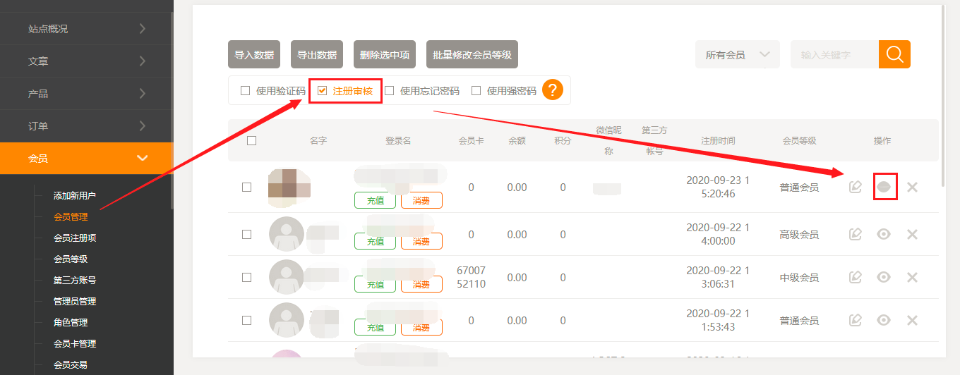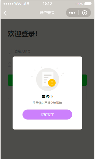 1. 在建站后台,“会员”-“会员管理”中开启注册审核时,通过小程序自动注册的账号也会正确进入待审核状态了,小程序中也会有相应的提示,如图所示: