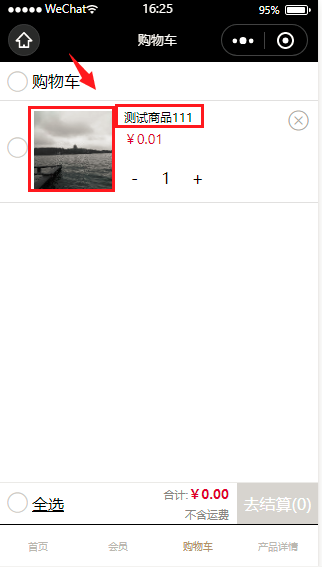 1. 在小程序的购物车中,现在点击产品名名称和产品图片会跳转至对应的产品详情页了,如图所示: