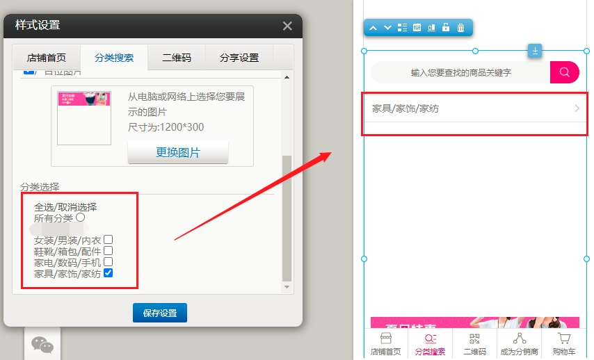 1. 在手机版建站中,拖出“分销店铺”插件,在分类搜索设置中,新增了分类的筛选。选择好分类后,店铺首页的产品也会随之更改,如图所示:
