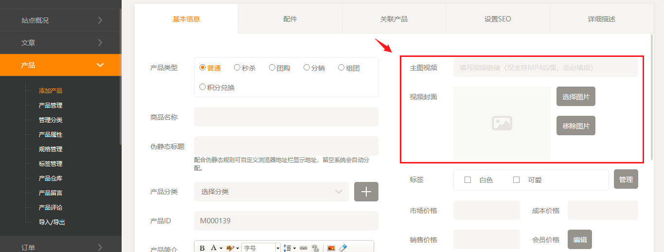1. 在建站后台,“产品”-“添加产品”中,进行主图视频和视频封面的设置。在手机站点中即可看到首图视频,如图所示: