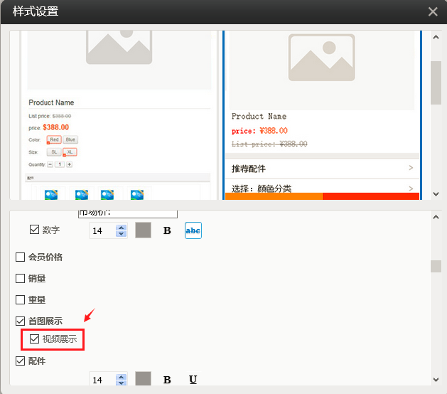 2. 在手机版建站,产品详情的设置项中可以控制是否显示视频,如图所示: