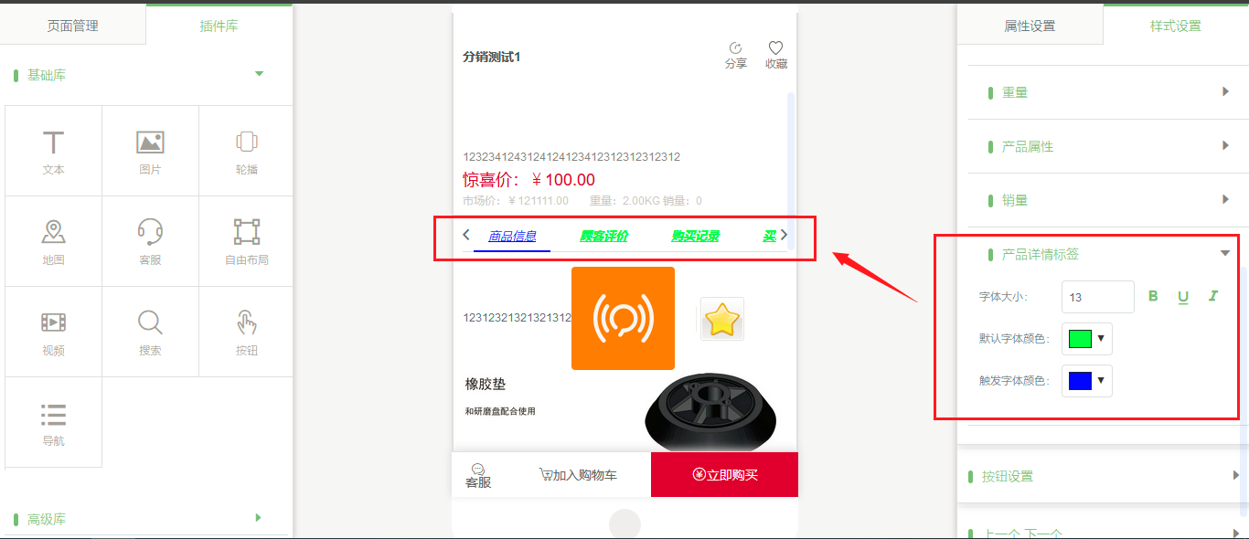 1. 在小程序编辑器中,拖出“产品详情”插件,点击样式设置,在文字设置中新增了产品详情标签的设置项,如图所示:
