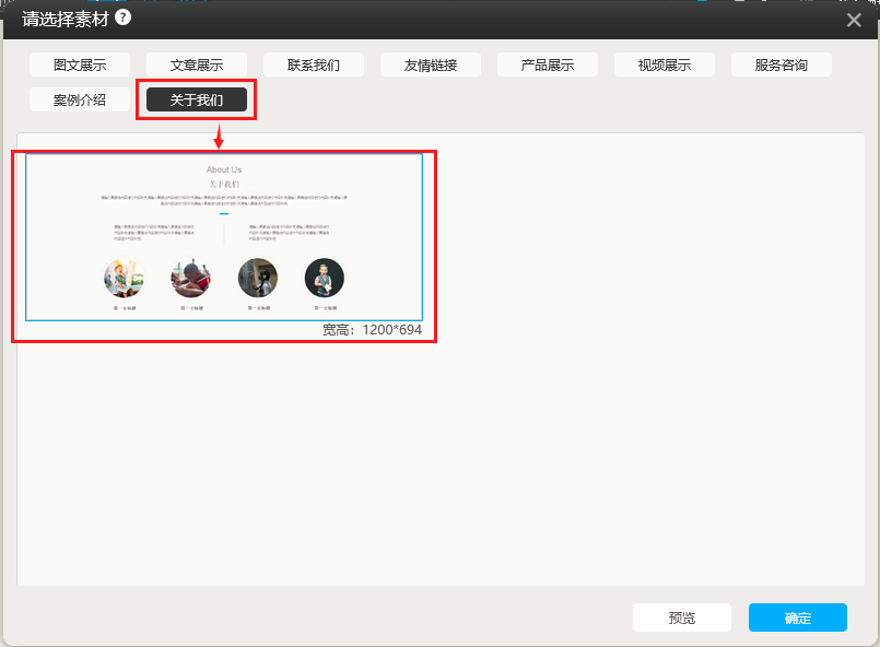 1. 在pc版建站,素材模块中新增了一个分类“关于我们”及一个样式,如图所示:
