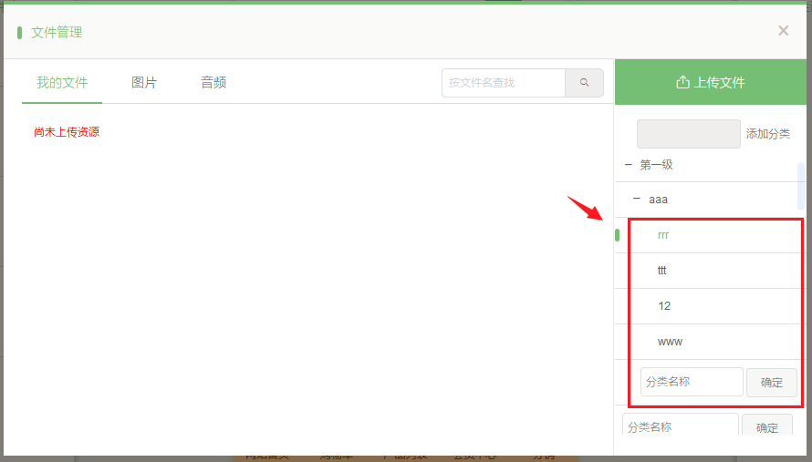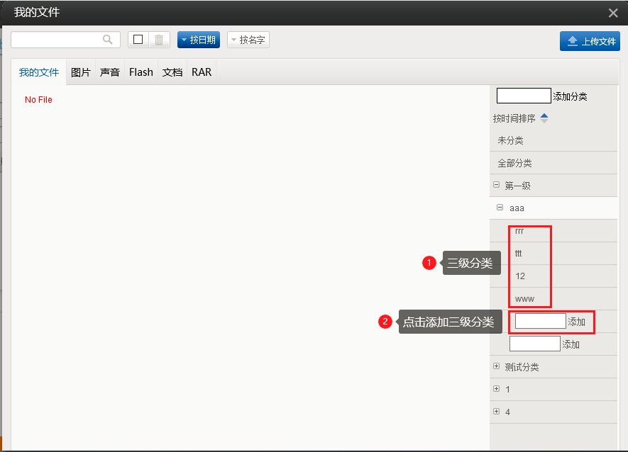 1. 在建站的文件管理系统中,现在支持文件的三级分类了(三级分类可以移动到任意二级分类下),如图所示: