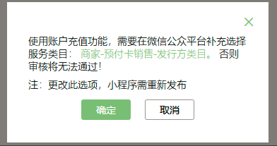 1. 在小程序编辑器中,“设置”-“会员中心设置”中的“账户充值”,现在点击单选框也会出现提示,提醒用户注意需要重新发布小程序才会生效,如图所示: