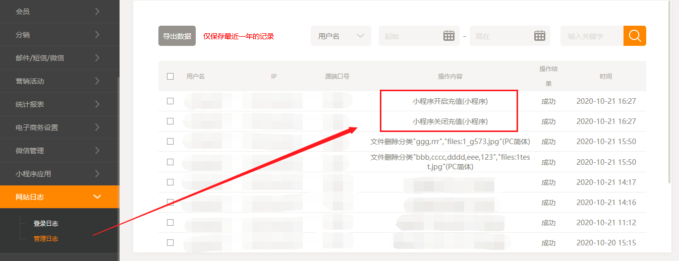 2. 在建站后台,“网站日志”-“管理日志”中,新增了账户充值模块开关的记录,如图所示: