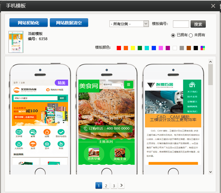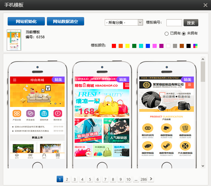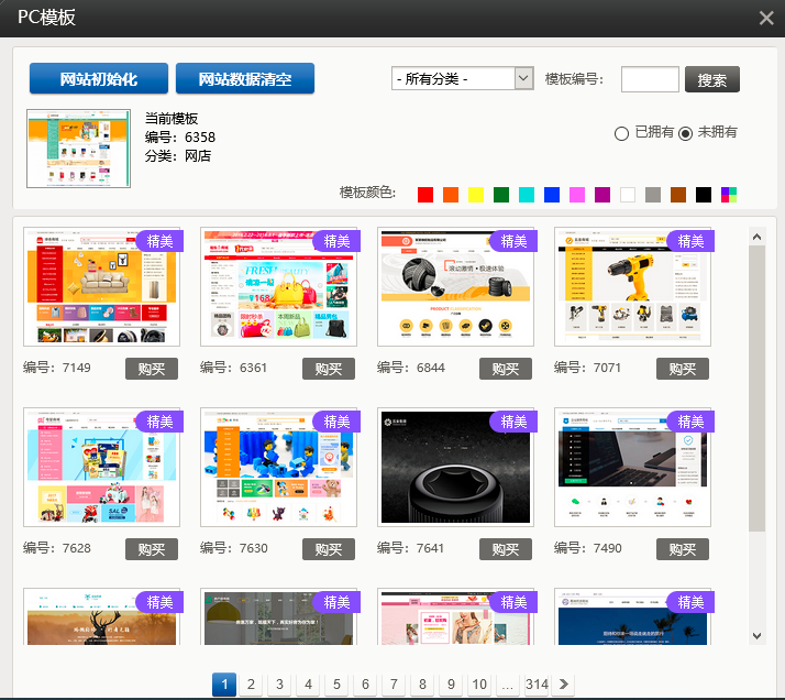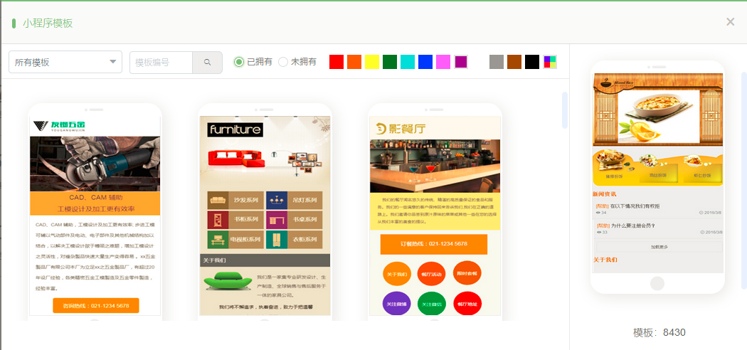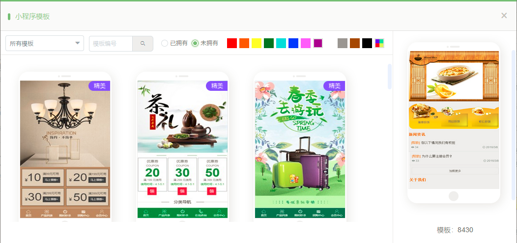 1. 在建站中,点击“模板”,现在新增了未拥有模板的查看分类;同时精美模板会有角标提示,如图所示: