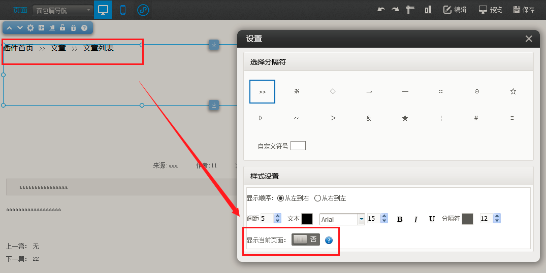 1. 在建站中,拖出“面包屑”插件,在样式设置中,新增了“显示当前页面”的设置项,如图所示: