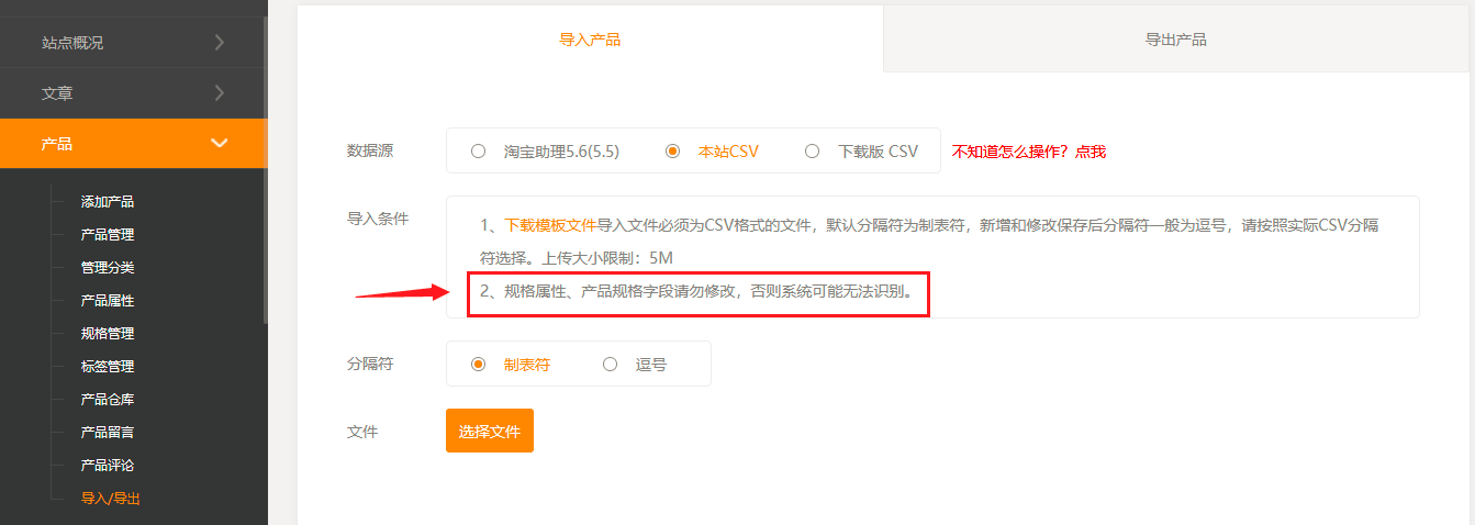 1. 在建站后台,“产品”-“导入/导出”-“导入产品”界面中,新增提示“规格属性、产品规格字段请勿修改,否则系统可能无法识别”,如图所示: