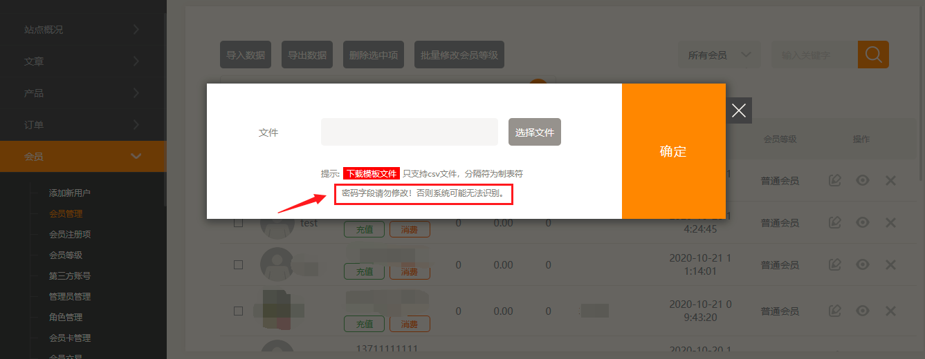 2. 在建站后台,“会员”-“会员管理”,点击导入数据,新增提示“密码字段请勿修改!否则系统可能无法识别”,如图所示: