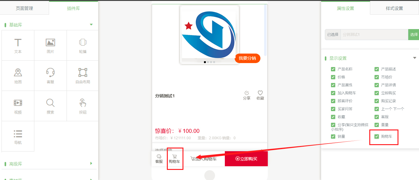 1. 在小程序编辑器,拖出“产品详情”插件。在显示设置中新增了购物车,勾选后的效果如图所示: