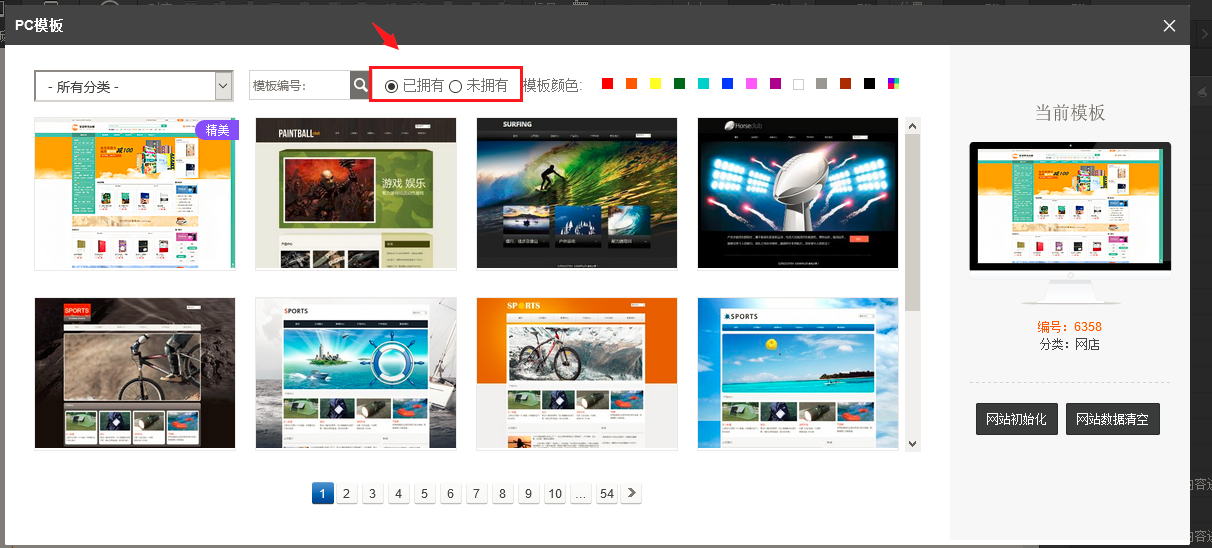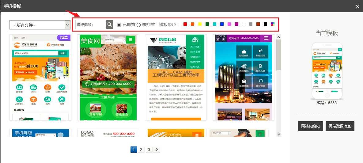 1. 在pc和手机的设计师模式中,模板也进行了优化:(1)按照已拥有和未拥有分类两类,(2)都支持按照分类和色系进行筛选了,(3)精美模板右上角有角标提示,如图所示: