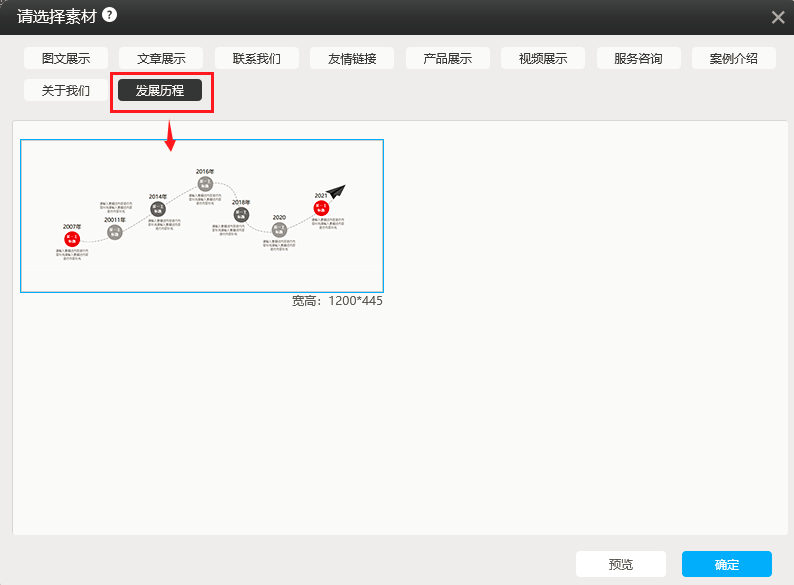 1. 在pc版建站,素材模块中新增了一个分类“发展历程”及一个样式,如图所示: