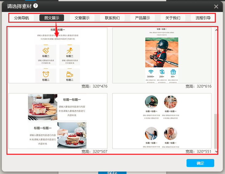 2. 在手机版建站,素材分类完全,同时在“图文展示”分类中新增了5个样式。